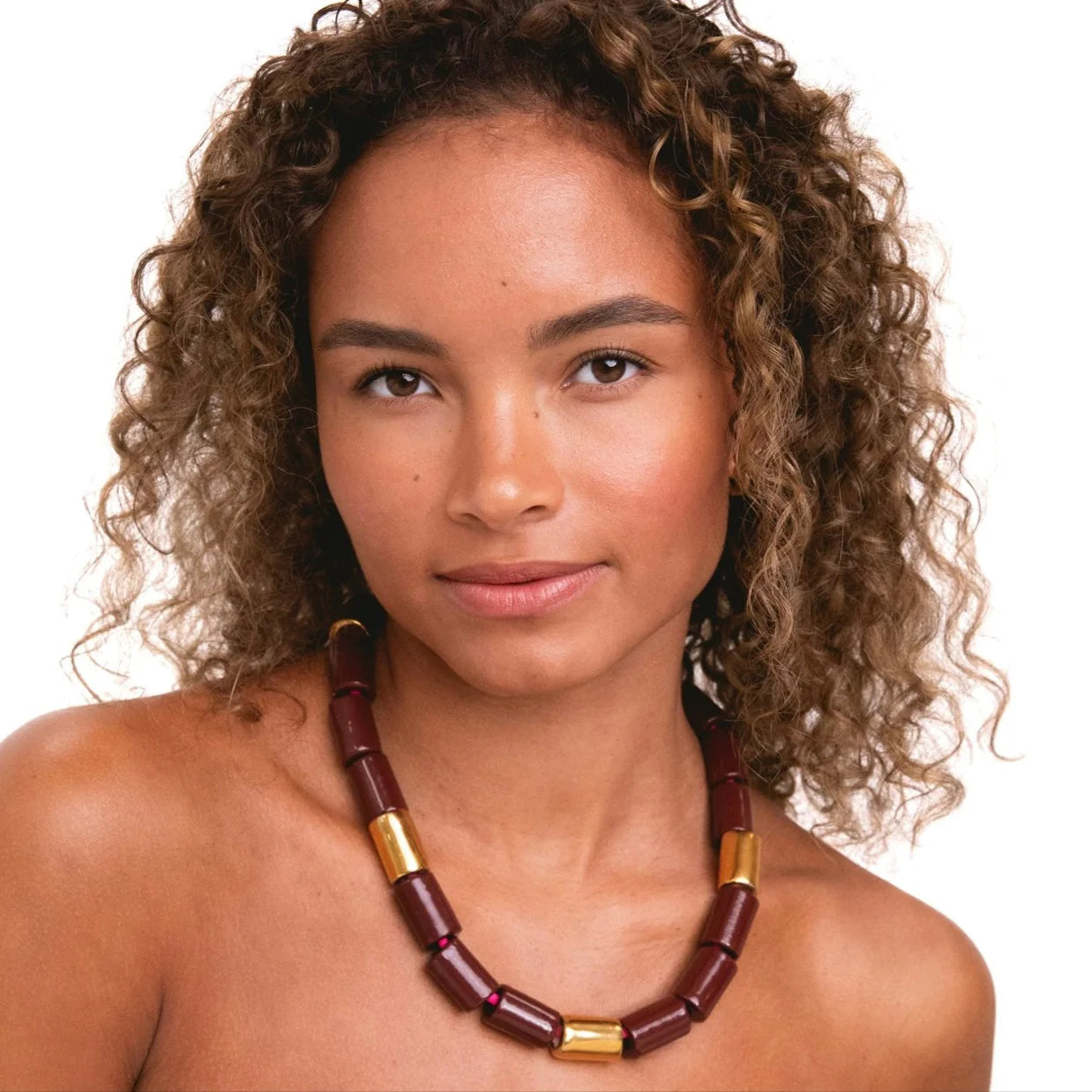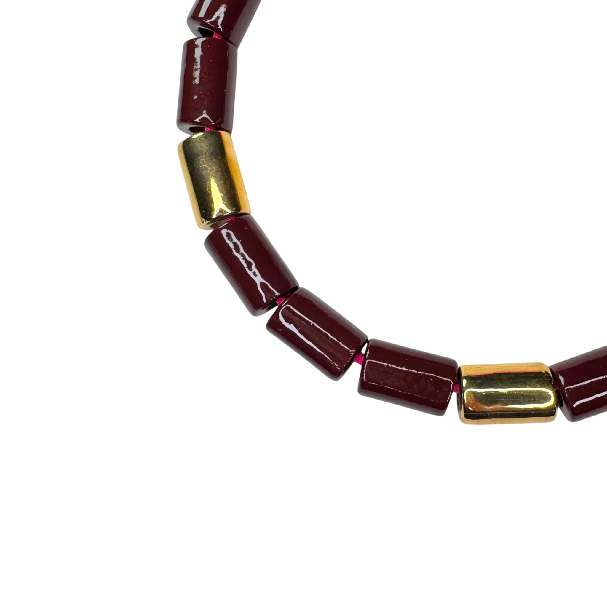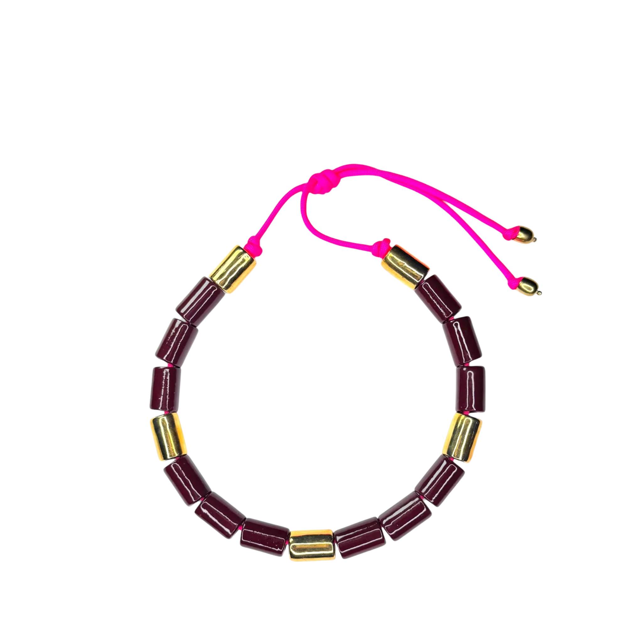 Burgundy-gloss and gold-gloss ceramic beads on neon pink cord. Handmade and knotted with brass end details. Adjustable length for easy styling.
