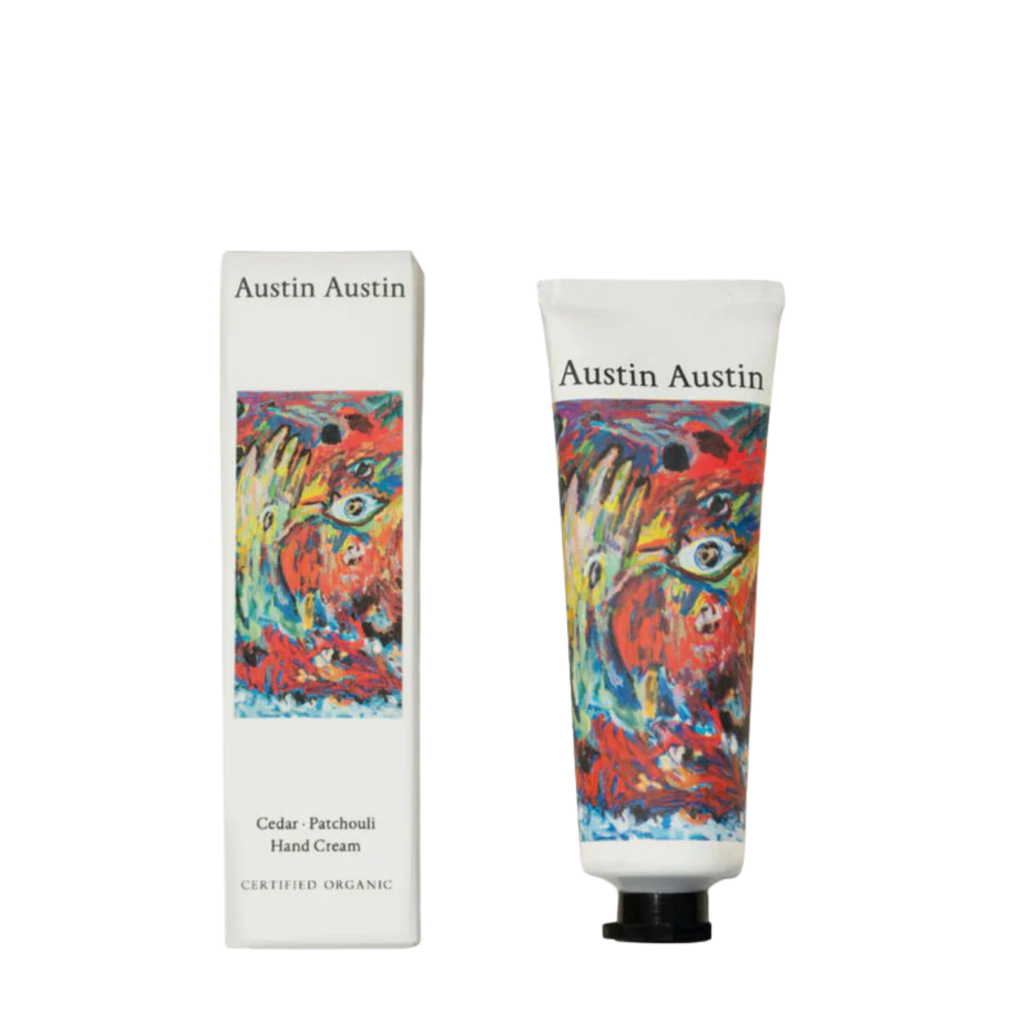 Austin Austin Cedar & Patchouli Hand Creme. Made with extracts of plants, grasses, seaweed and algae to moisturize and protect. The essential oil fragrance balances the deep woodiness of cedar and patchouli with the pepper of geranium and coriander.