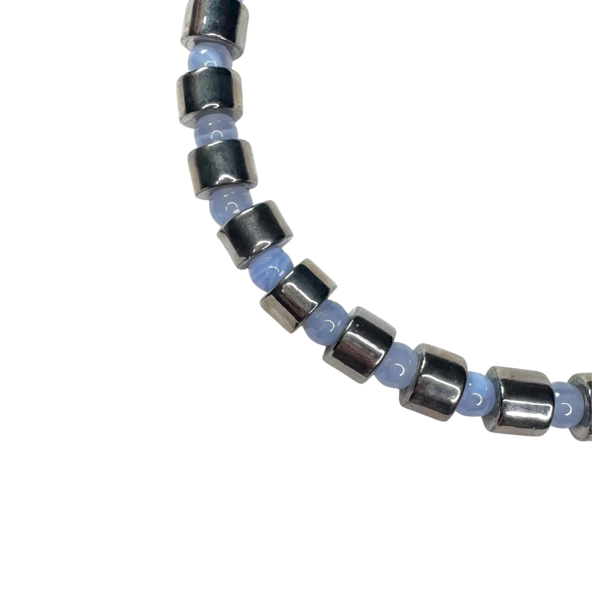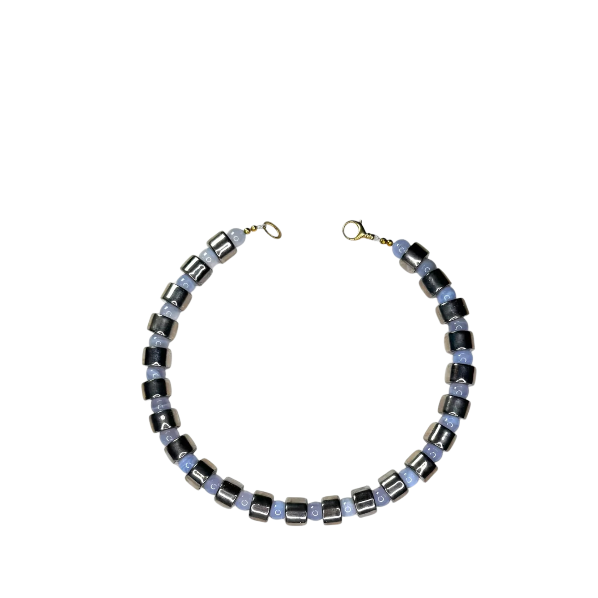 Silver-metallic gloss ceramic beads paired with blue lace agate, mixed with semi-precious accents. Finished with a raw brass closure. Approximately eighteen inches long. Limited production.