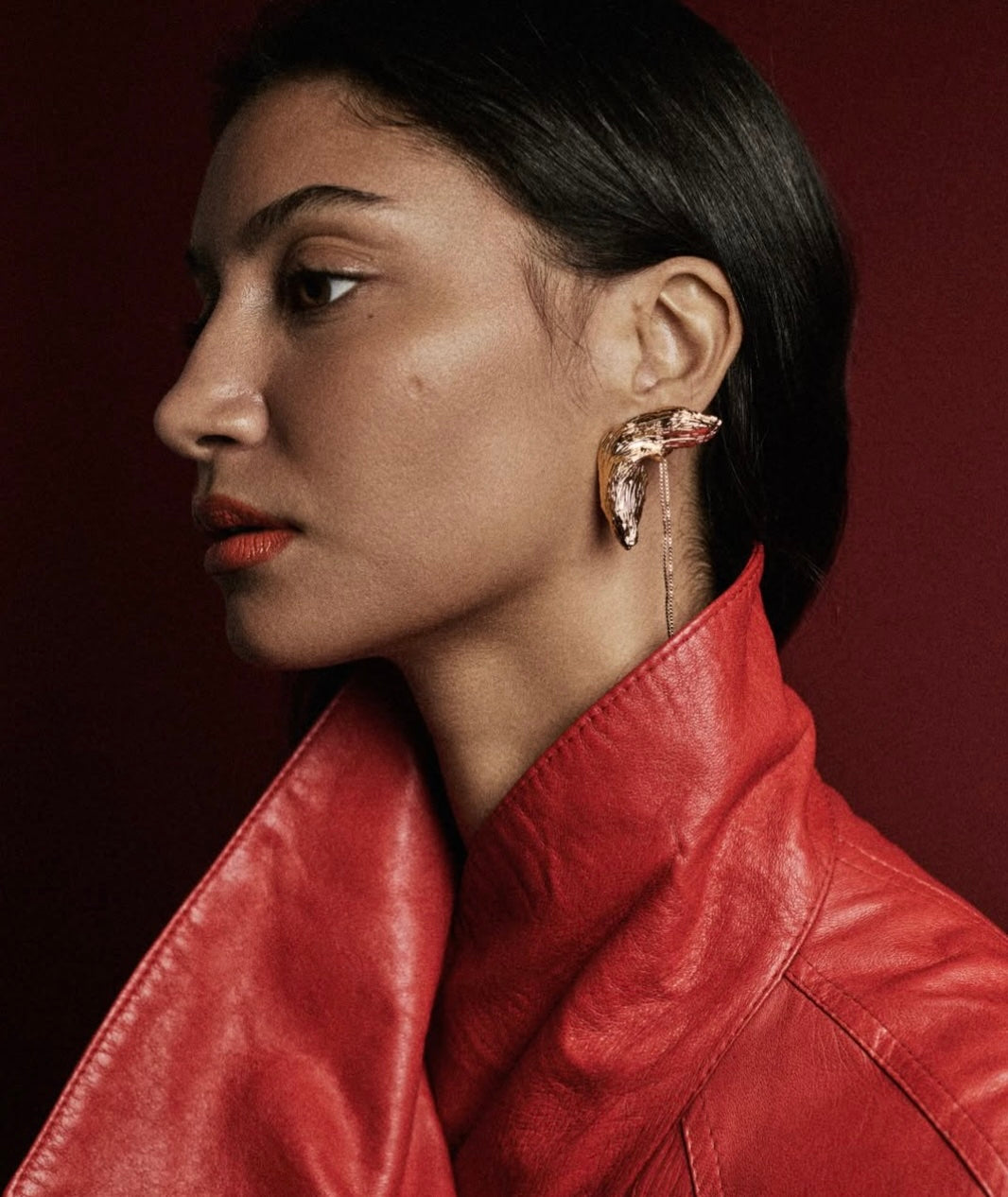 Ridged and arched hand carved earrings with tasseled chain.