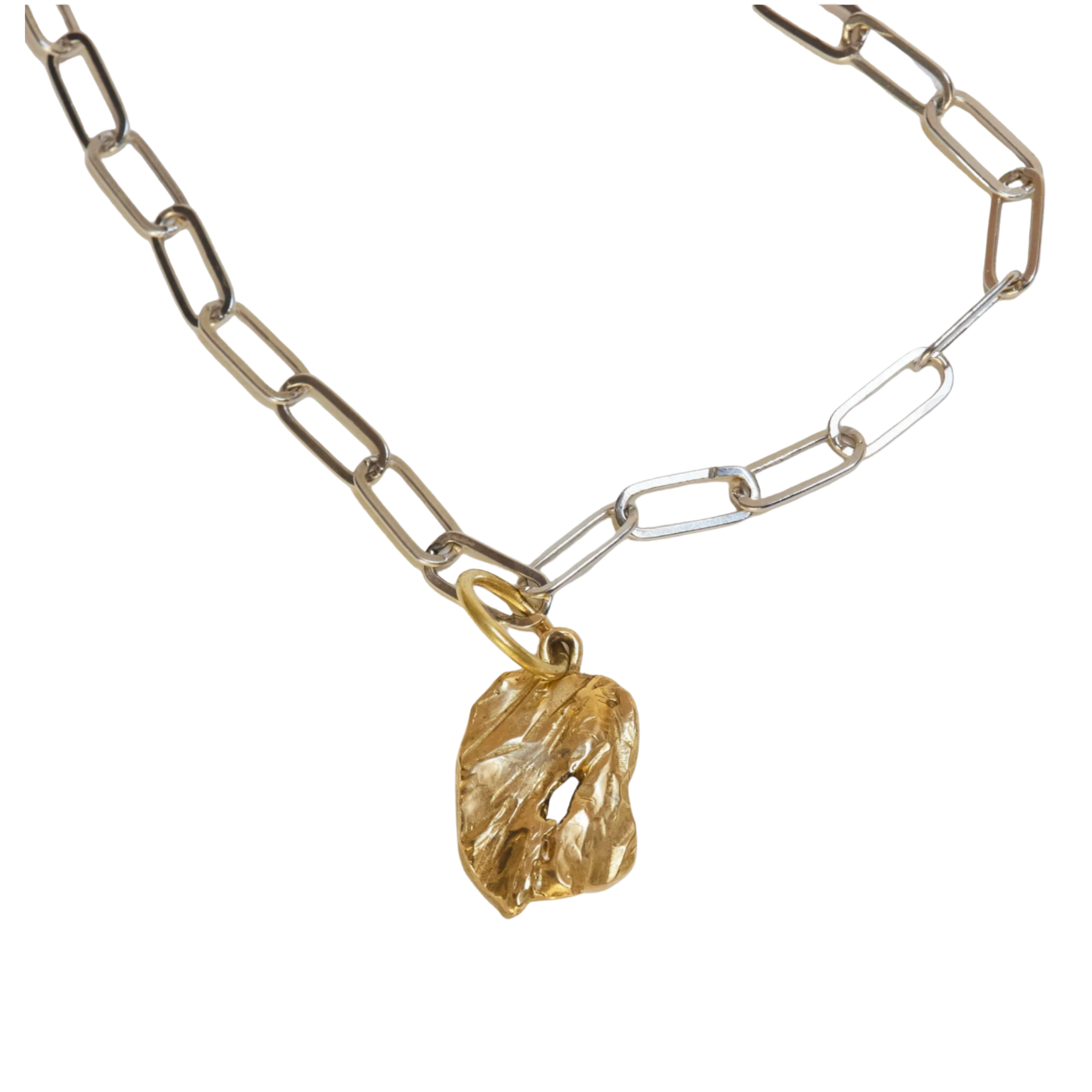 Hand carved gold plated pendant on sterling silver paperclip chain. 16” long.