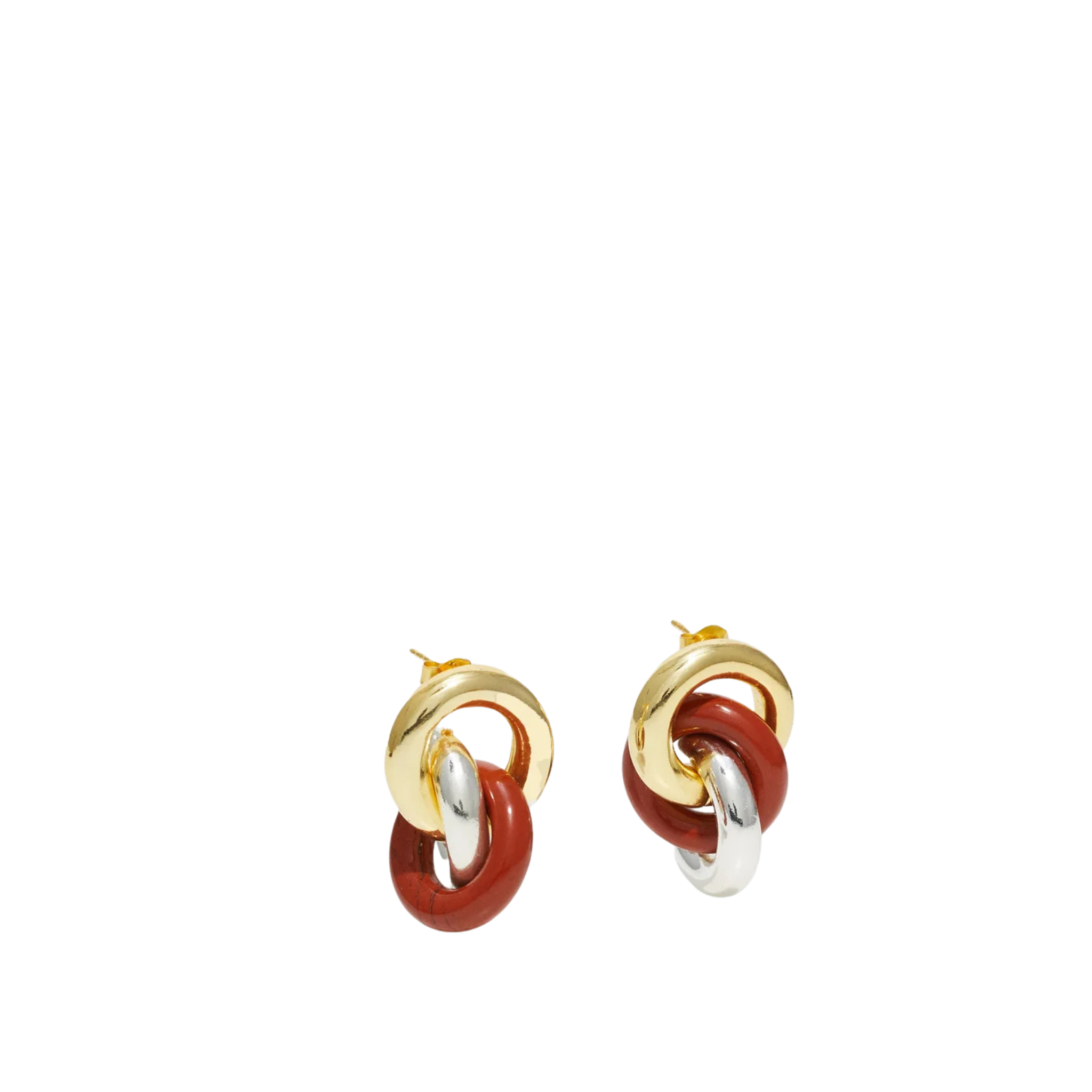 The 'Tendril' earrings have an interlocking design made from vermeil and sterling silver, and red jasper hoops.